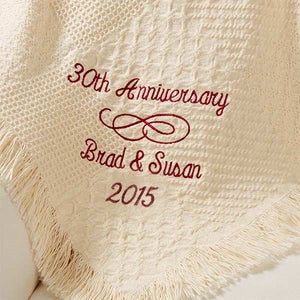 To commemorate the happy couple's years of wedded bliss, we custom embroider their years together along with their first names and current anniversary year in your choice of 13 thread colors.