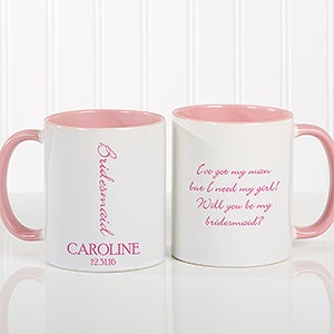 Each coffee mug is printed with their name and title in the bridal party, then on the back of the mug choose any 4-line sentimental message. Choose from our 6 print color options.