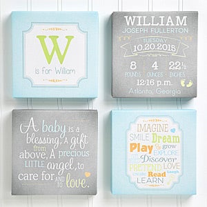 You can personalize 2 of the 4 canvases. The first one is personalized with your baby's initial and name, the second canvas includes theirname, day of birth, birthdate, size, weight, time and city and state of birth. The other 2 canvases offer fun text and darling quote.