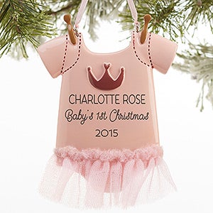 We professionally laser engrave each ornament with baby's name and any 2 lines of personalization you choose. The ornament is made complete with a genuine tulle tutu skirt and 3D detailed princess crown and sleeves.