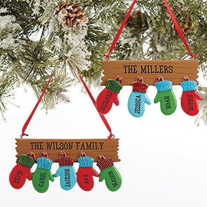 We professionally laser engrave the exclusiveornament with their last name and first names. Our adorable design features mittens with knit details on the cuff in bright colors hanging from a wood inspired plaque.