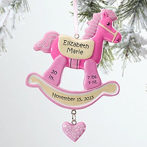 We professionally laser engrave each ornament with baby's name, length, weight and any personalization you choose at the bottom of the ornament. The ornament is made complete with a dangling heart (the pink one is accented with glitter).