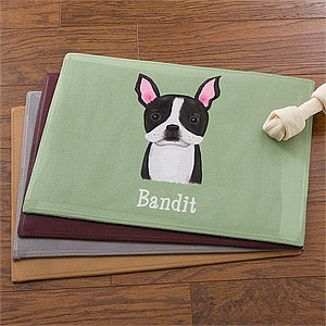 We personalize each mat with a choice of 33 breeds, 8 background colors and your dog's name.